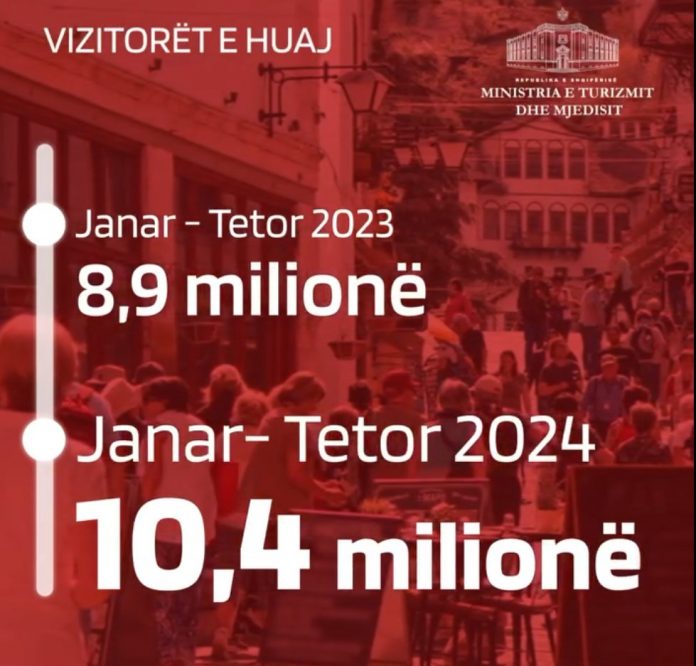 Ministrja e Turizmit dhe Mjedisit Mirela Kumbaro ka bërë publike shifrat e vizitorëve të huaj, ku përgjatë periudhës janar-tetor 2024 Shqipëria është vizituar nga 10,4 milionë vizitorë të huaj.