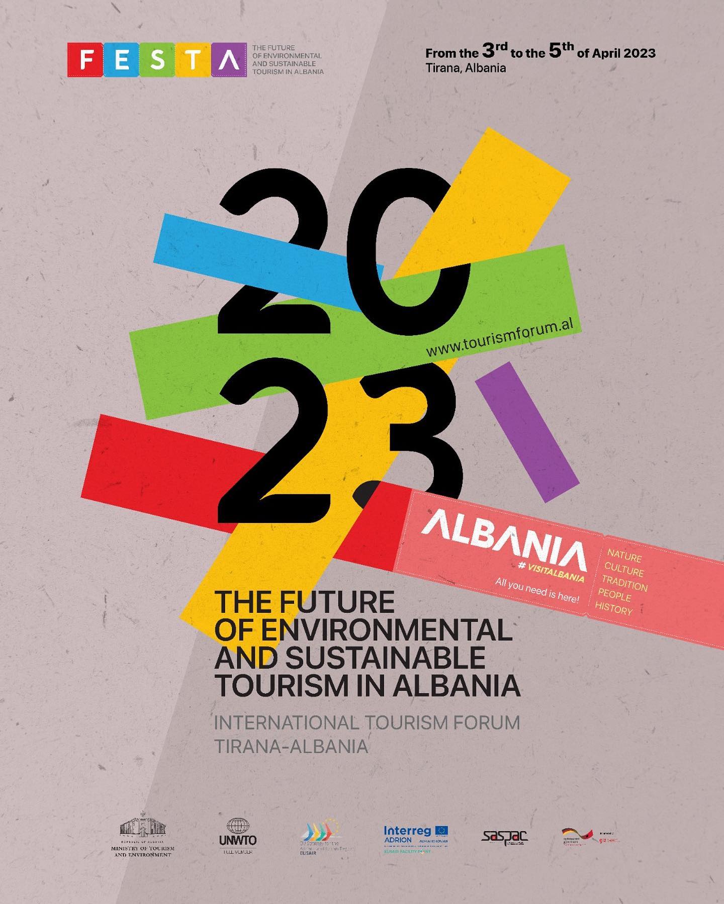 Ministria e Turizmit dhe Mjedisit në bashkëpunim me Organizatën Botërore të Turizmit organizon më datat 3, 4 dhe 5 prill në Tiranë forumin ndërkombëtar të turizmit “FESTA—The Future of Environmental and Sustainable Tourism”.