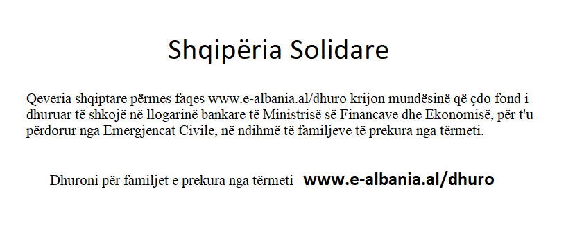 Qeveria shqiptare përmes faqes www.e-albania.al/dhuro krijon mundësinë që çdo fond i dhuruar të shkojë në llogarinë bankare të Ministrisë së Financave dhe Ekonomisë, për t’u përdorur nga Emergjencat Civile, në ndihmë të familjeve të prekura nga tërmeti.