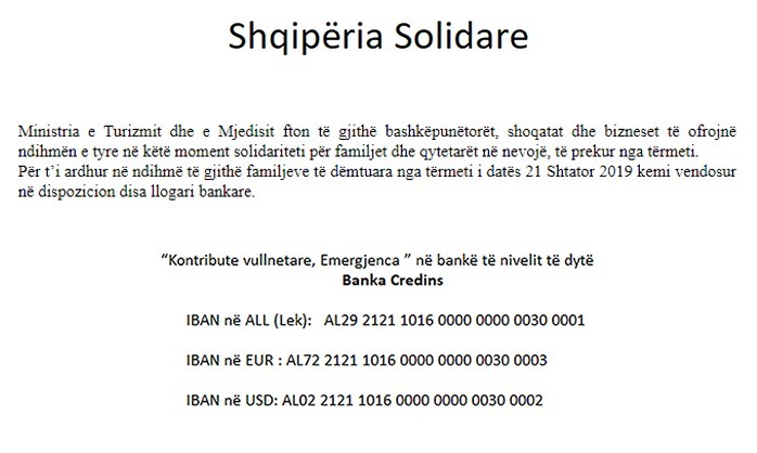 Ministria e Turizmit dhe e Mjedisit fton të gjithë bashkëpunëtorët, shoqatat dhe bizneset të ofrojnë ndihmën e tyre në këtë moment solidariteti për familjet dhe qytetarët në nevojë, të prekur nga tërmeti.